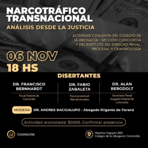 El Colegio de la Abogacía Sección Concordia, en conjunto con el Instituto del Derecho Penal, Procesal y Criminología, anuncia la realización de una importante jornada de análisis y capacitación sobre “Narcotráfico Transnacional: Análisis desde la Justicia”.